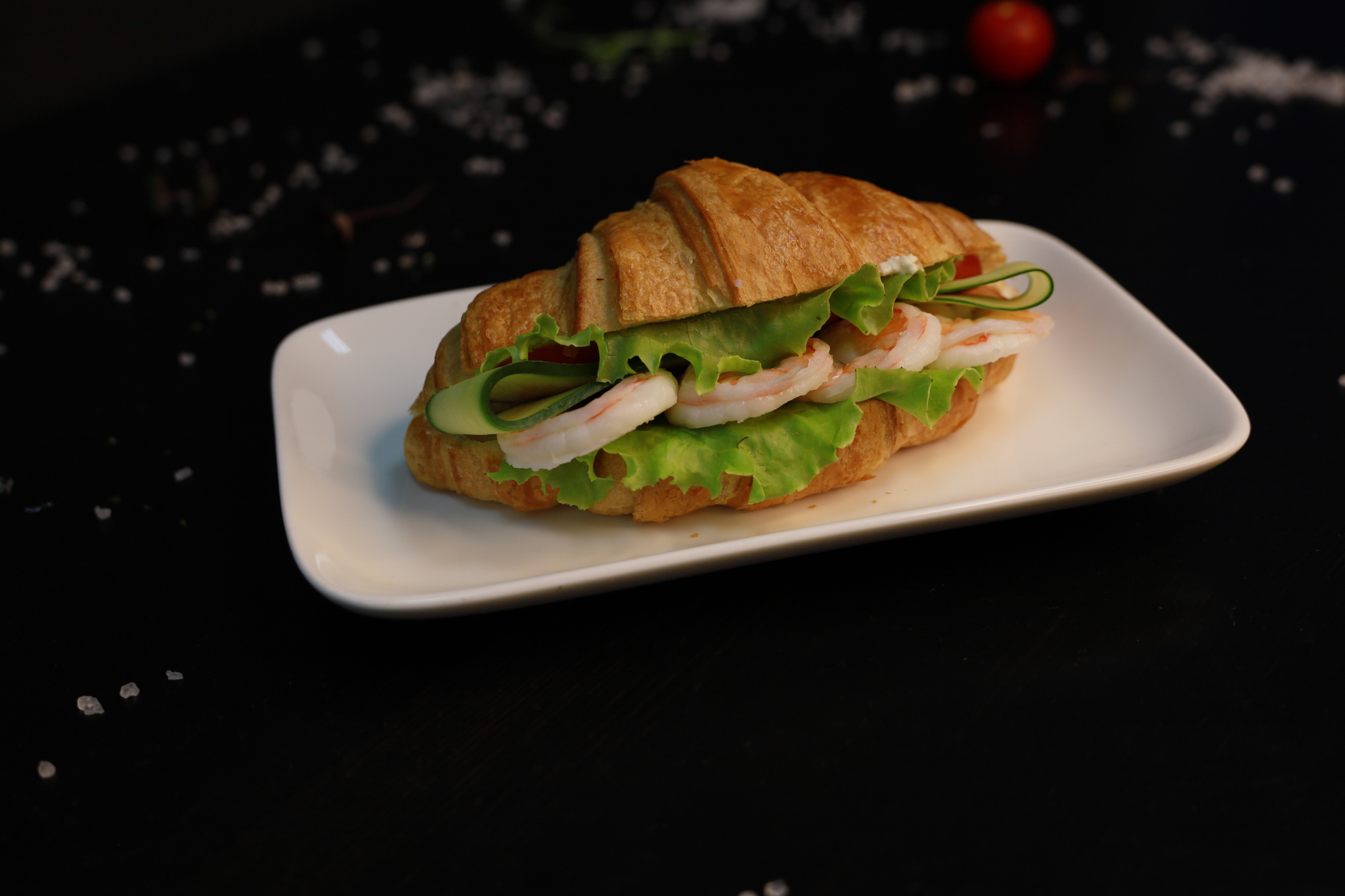 Состав: КруассанСоусЛистья салатаТоматы черриТигровые креветкиОгурец свежий